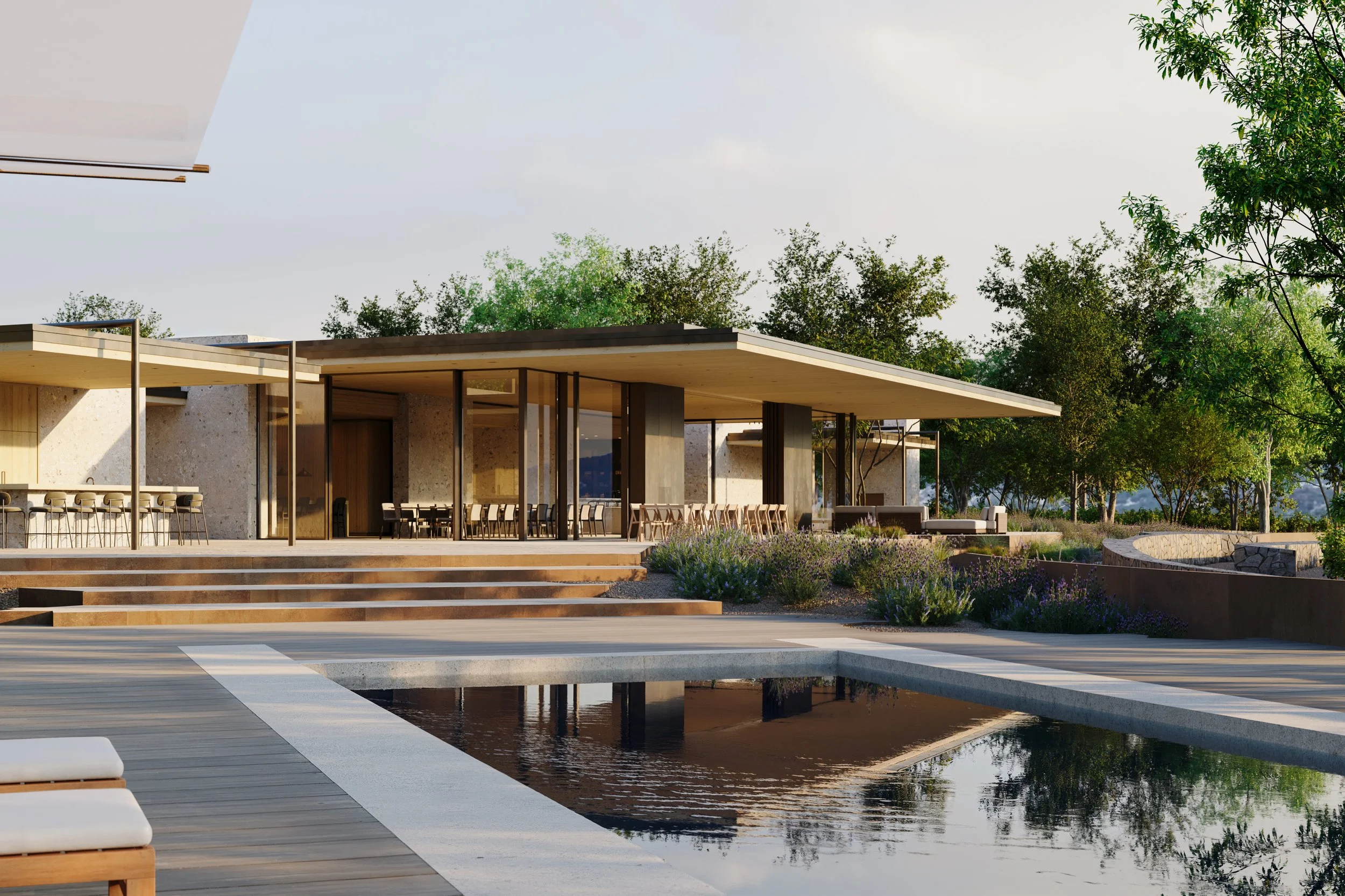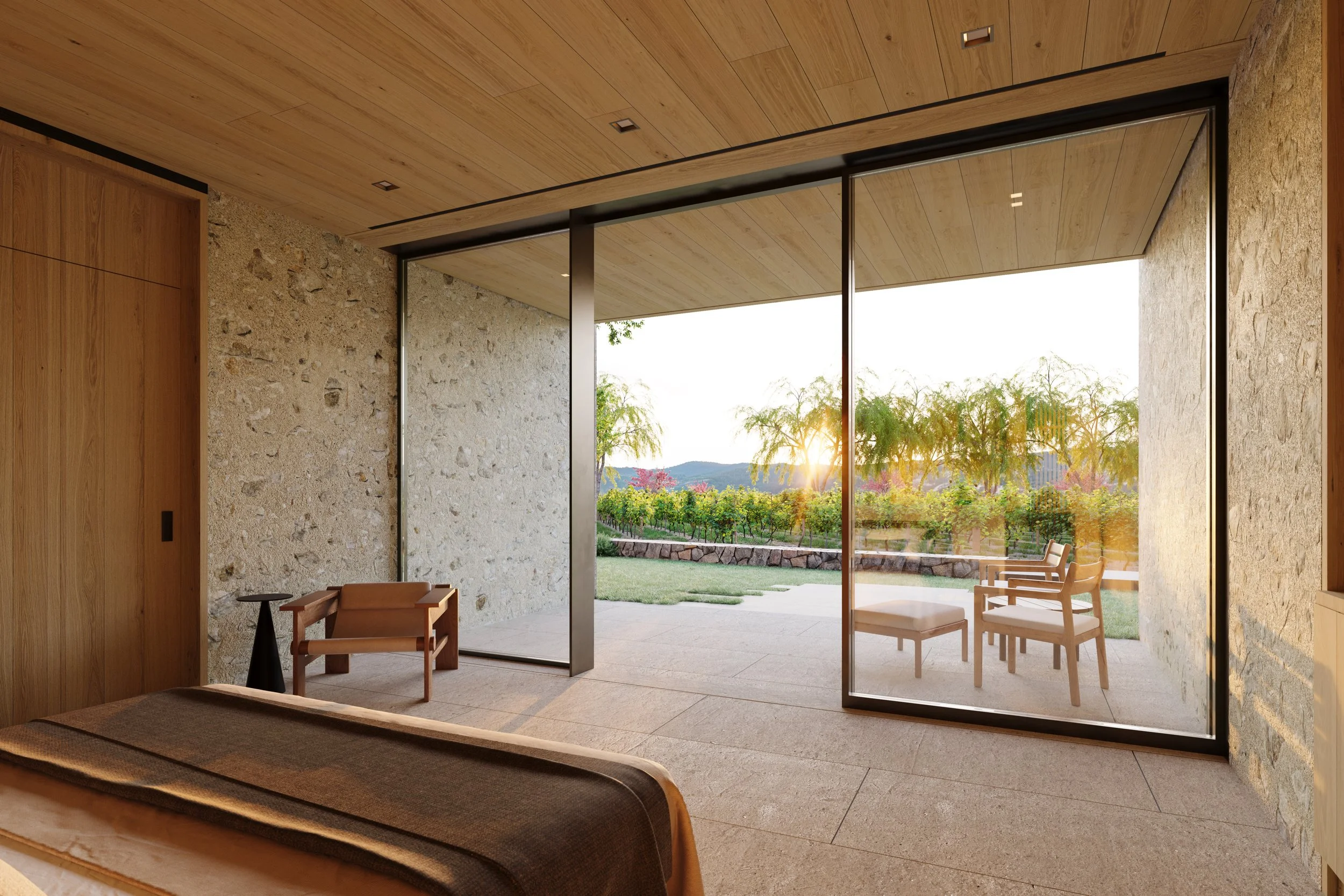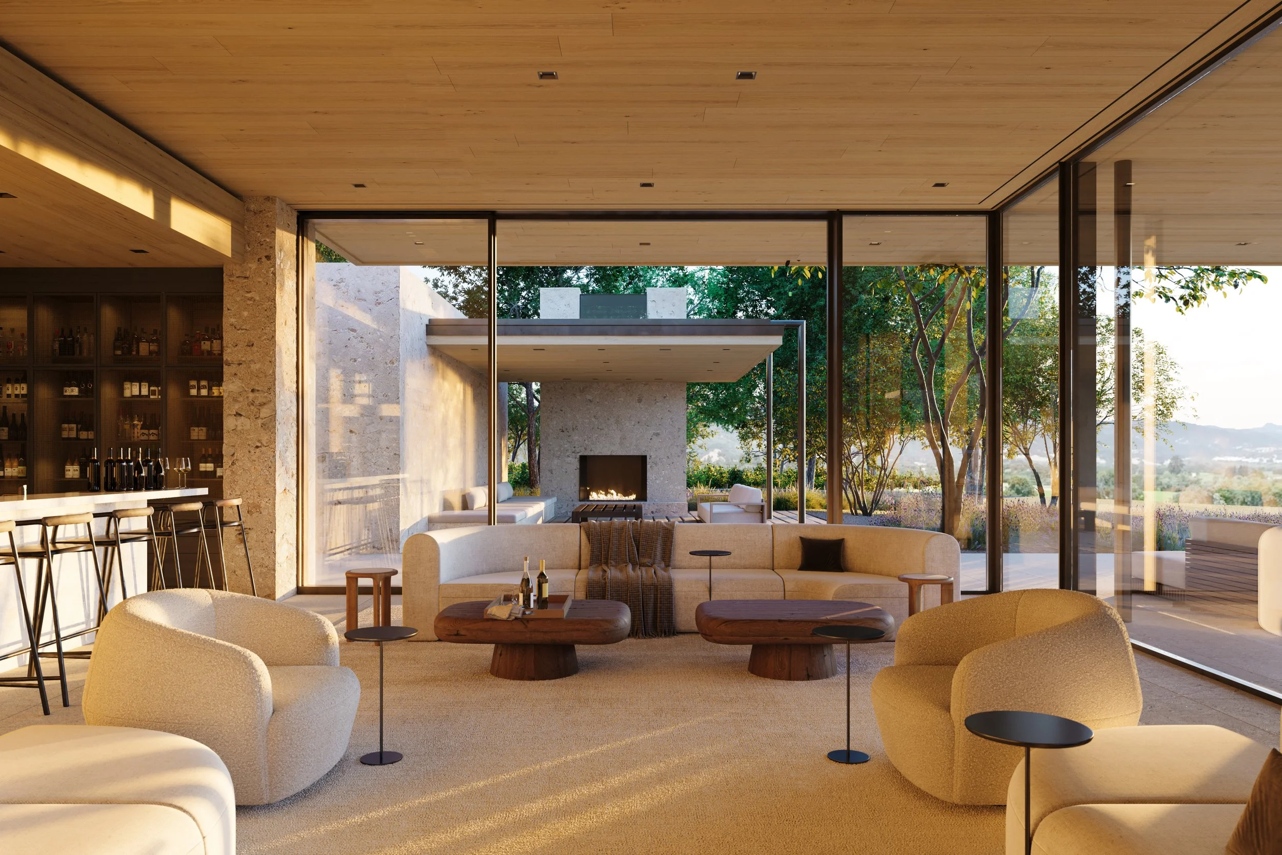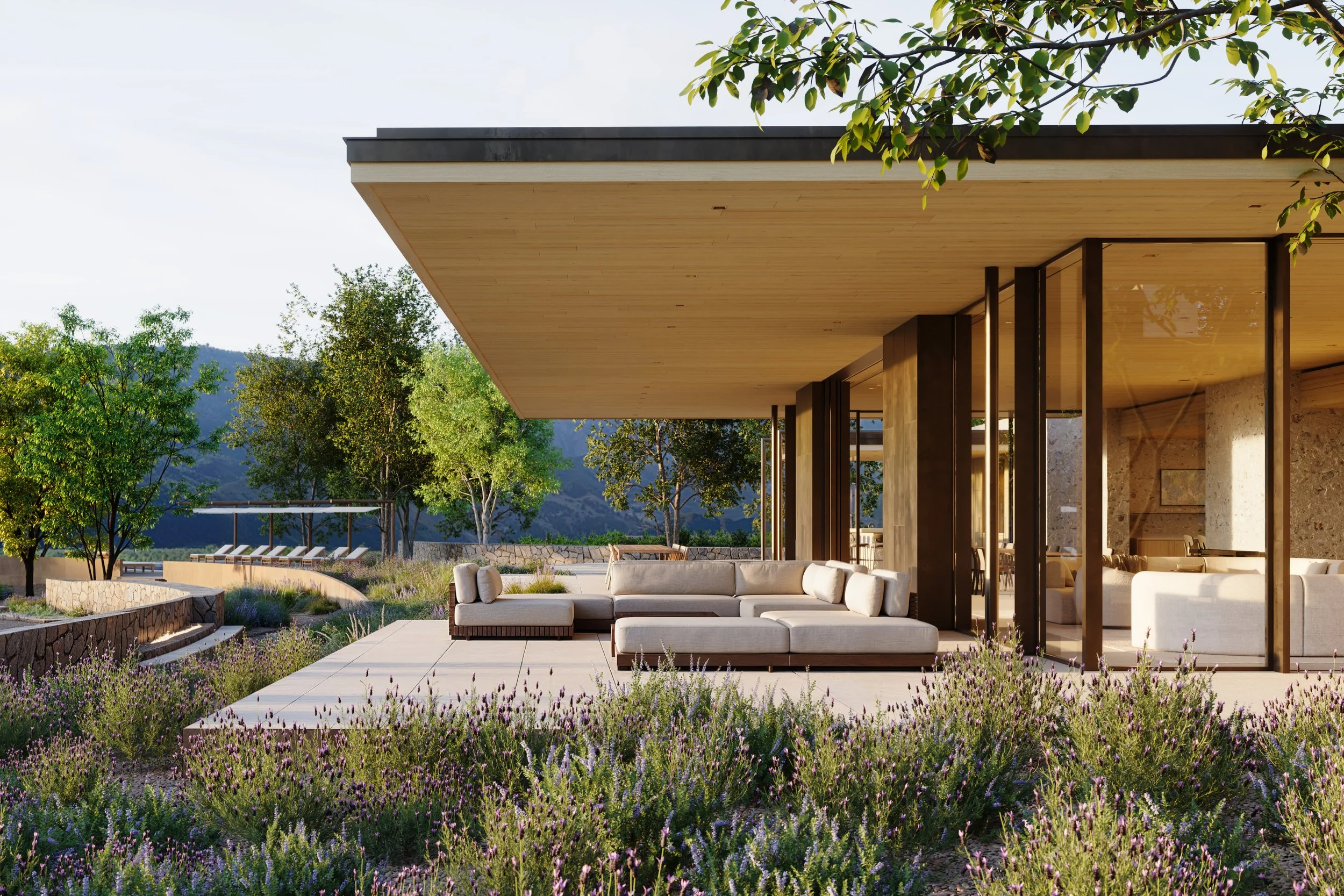 This expansive Napa Valley estate sits in the midst of a lush landscape of olive trees, waving grasses, and grape vines. Of special note for us was getting the unique exterior stone texture to read just right.